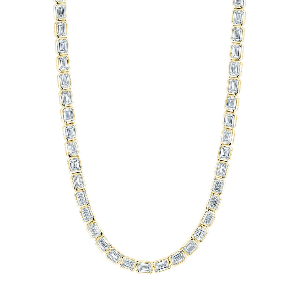 Discover elegance with our 18K Yellow Gold 16" East West Emerald-Cut Diamond Bezel-Set Tennis Necklace, 10ct G-H, VS featuring 10.0 carats of Diamond in a stunning 18K Yellow Gold setting. Perfect for those who appreciate luxury and sophistication, this Necklaces is designed to dazzle on any occasion. Crafted with G-H, VS stones for unmatched brilliance.