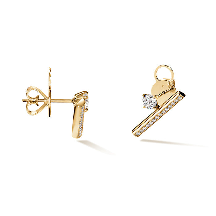 Reflective of the dreamy brilliance of the quay lights along the harbor,with its dramatic mosaic of buildings melting into the horizon, the Barre Floating Single Diamond Pave Climber Earrings twinkle and shine using a unique setting style that gives the illusion of the diamonds dangling from a strong, linear gold bar.