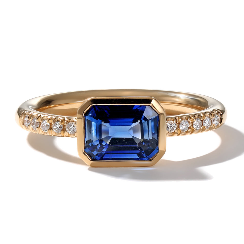 This ageless design inspired by the Art Deco era showcases a striking and brilliant emerald cut sapphire that rests within a smooth bezel setting. Twinkling diamonds cascade downwards along the shank, adding a touch of sparkle that shimmers with each movement. We love this classic yet modern style worn solo for a lasting impact.