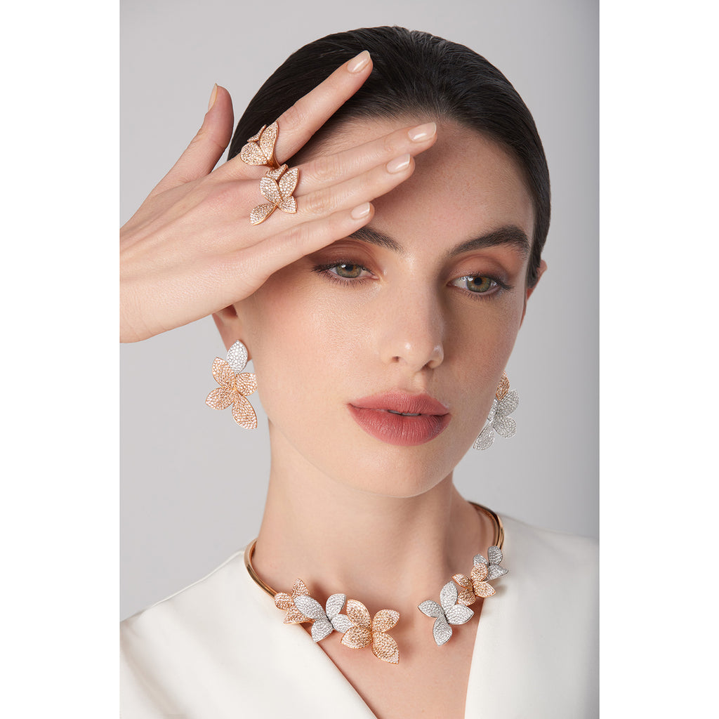 Multi Flower Collier in 18k Rose and White Gold with White and Champagne Diamonds.
