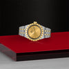 Notched bezel in yellow gold, alternating cut grooves and polished finish