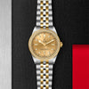 First center links in steel or solid yellow gold. Remaining centre links are made of a steel core capped with 0.2mm of yellow gold. TUDOR "T-fit" folding clasp with safety catch. The logo on the catch is made of solid yellow gold