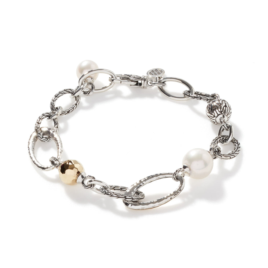 Classic Chain Hammered 18K Gold & Silver Bracelet with Lobster Clasp with 7-7.5mm and 9-9.5mm Cultured Fresh Water Pearl, Size UM BG