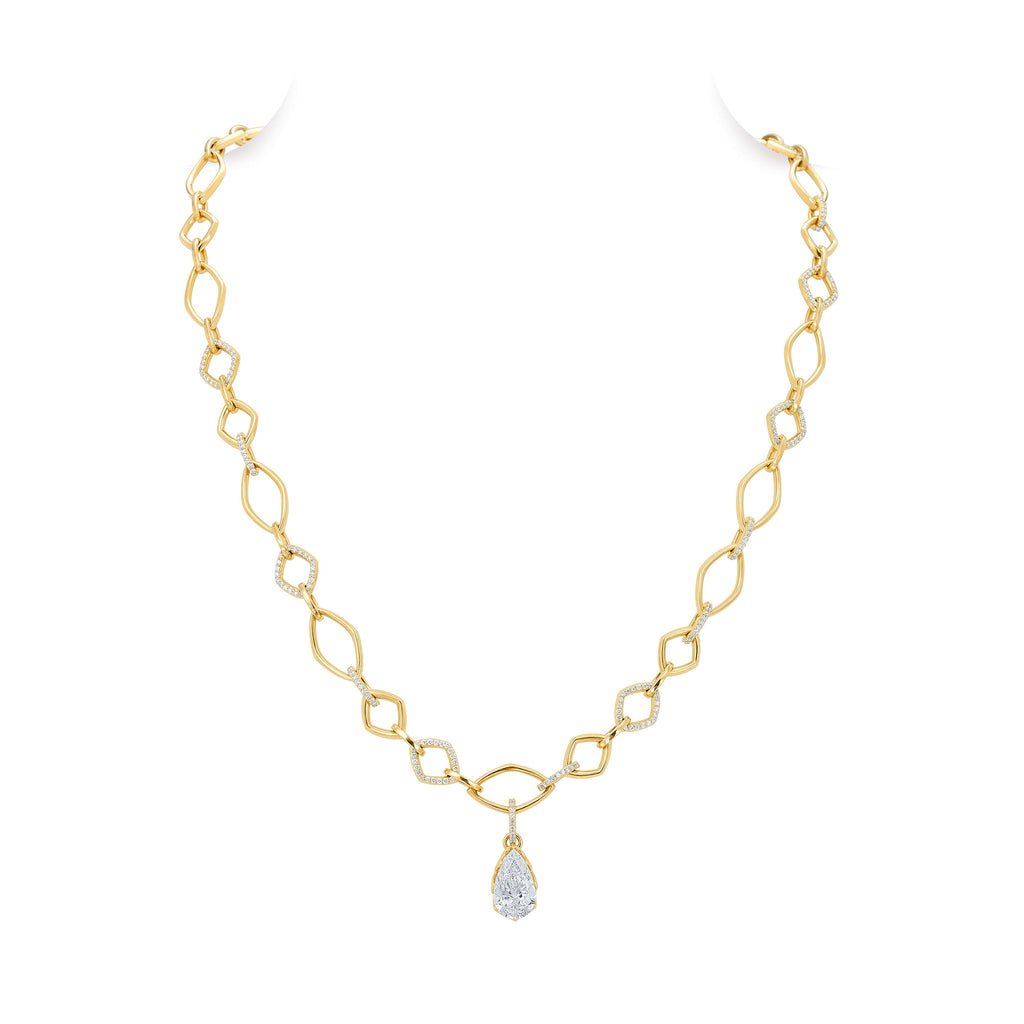 An elegant 18K yellow gold necklace featuring a 3.13-carat pear-shaped diamond (F/SI2, GIA certified) complemented by 1.21 carats of additional diamonds. This piece offers a luxurious blend of sophistication and brilliance, ideal for any occasion.