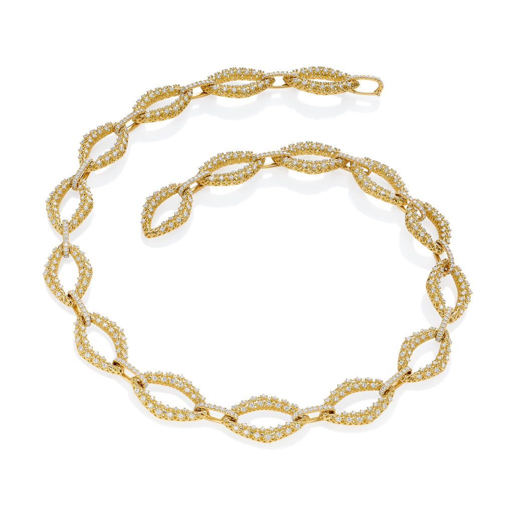 This stunning statement necklace in 18K yellow gold dazzles with 663 diamonds totaling 12.50 carats. With adjustable clasps for 17" and 23" lengths, it brings elegance and flexibility to your collection.