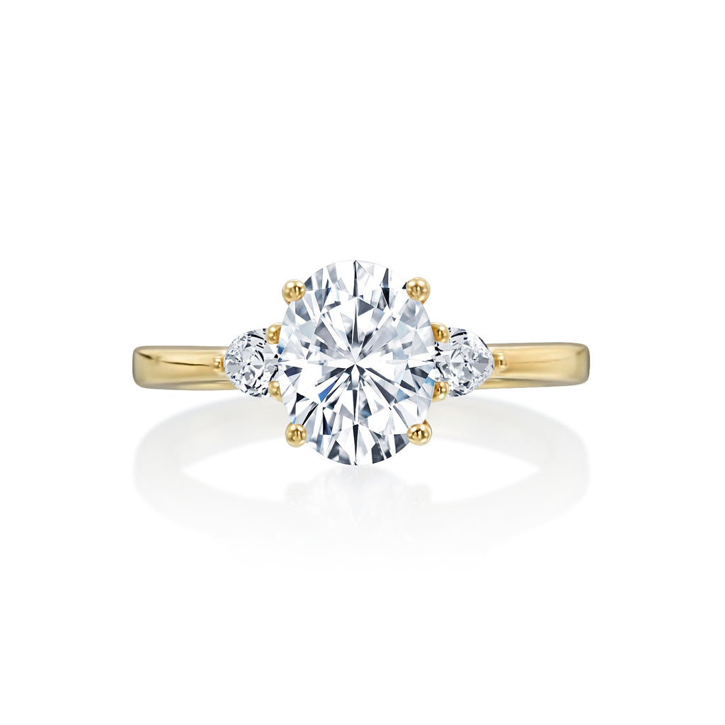 SKU RN-3ST-OCPS-YG-14-4Oval center with pear side stones wedding ring River North collection. Diamonds equal .28 CTW.